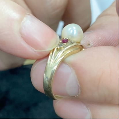 長大後有一天仔細看了一下這個戒指,才突然發現有一個缺口,原來是上面的紅寶石掉了。但是媽媽不以為意,還說又沒有什麼人看,不用特別去維護。雖然這麼說,但是我知道媽媽一定非常喜歡這一個珍珠戒指。再多次爭取後,終於從媽媽手上取下這個珍珠戒指來到『昇達珠寶』維修。