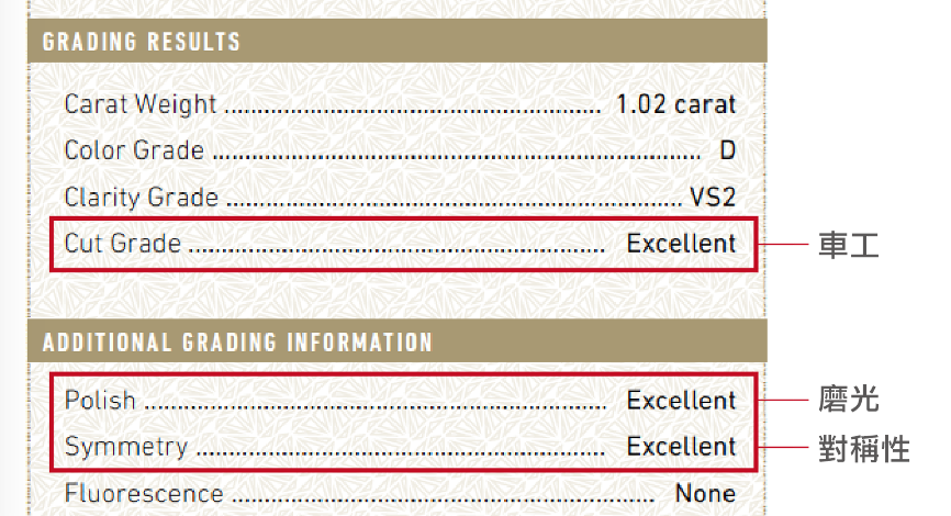 網路上常見的「GIA 3EX」,便是指上述的車工(Cut)、對稱性(Symmetry)、抛光(Polish)三項指標皆達到「Excellent」等級。